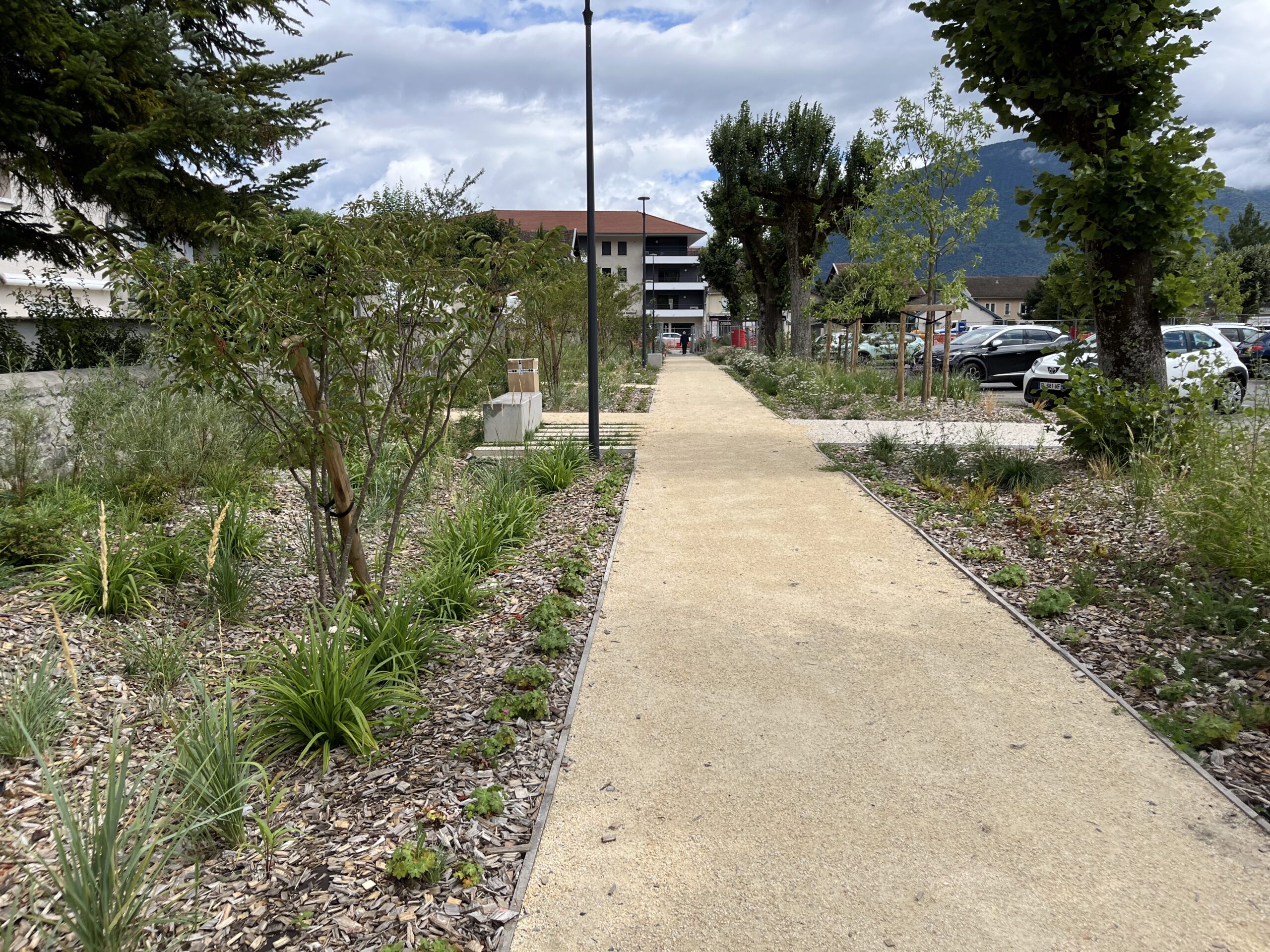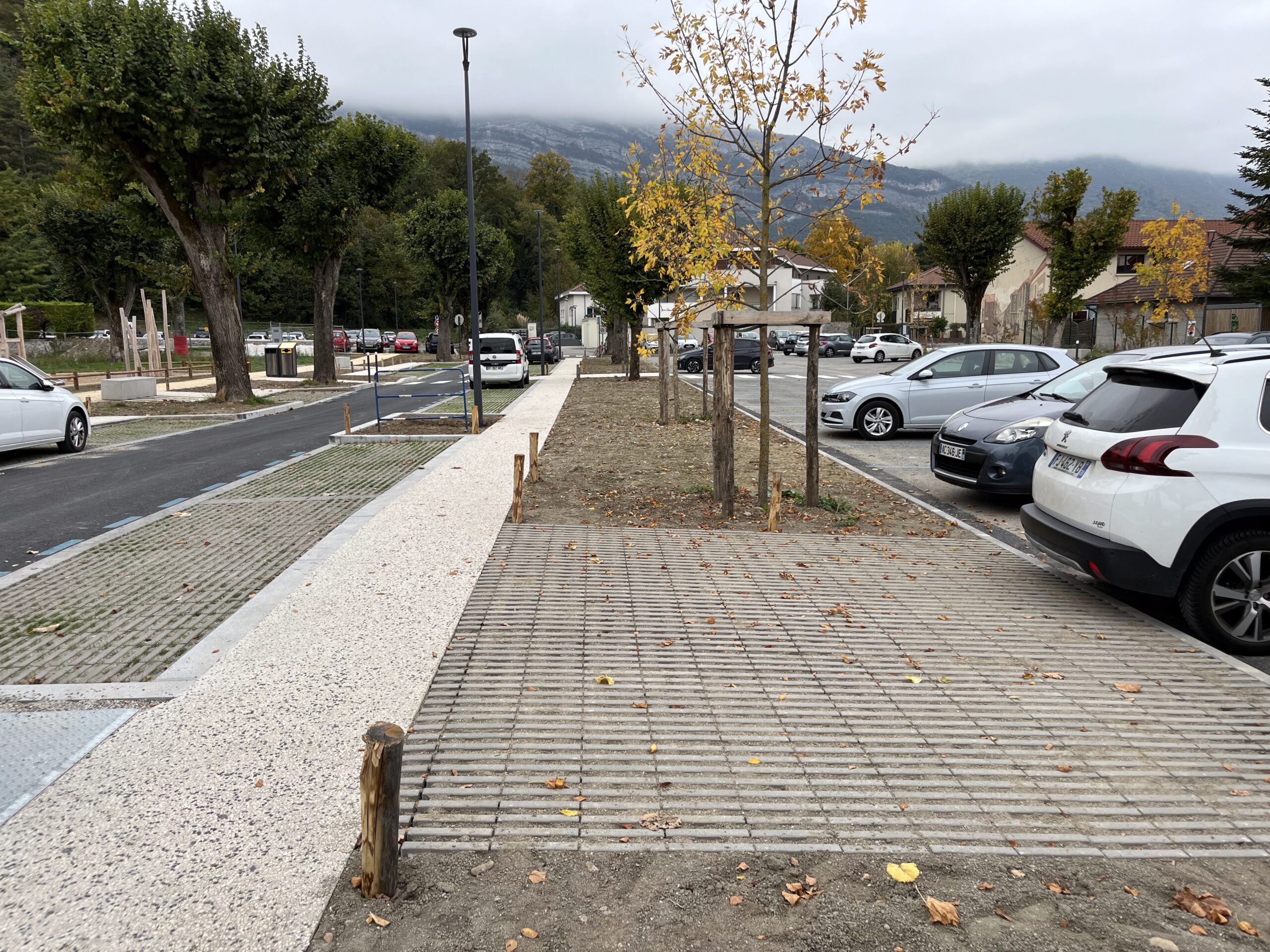 Un nouveau sol, des plantations et un square agrandi redonnent vie à cet espace central du quotidien. Un cheminement piéton arboré relie désormais la Mairie à la place du marché, offrant une promenade agréable. À l’ouest, un parking végétalisé a également vu le jour.